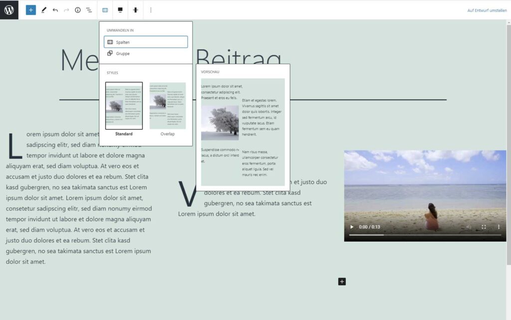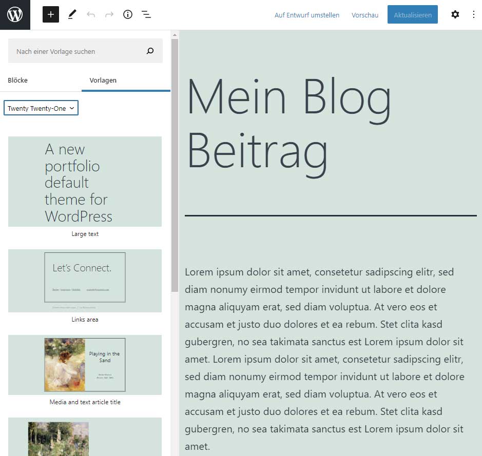 Das besondere mit dem neuen Theme ist, dass es einige Block Vorlagen mitbringt, die mit WordPress 5.5 eingeführt wurden.