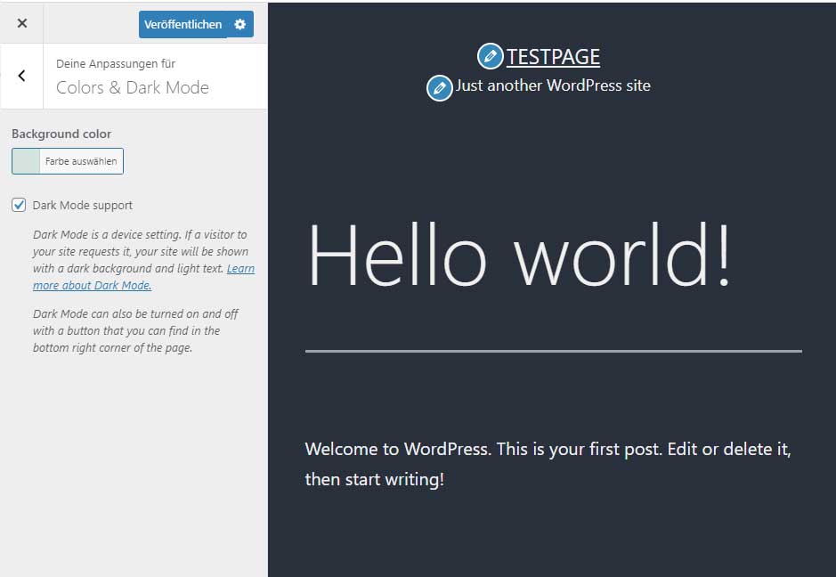 Im Customizer kann unter „Colors & Dark Mode“ der Dark Mode aktiviert werden. Erkennt WordPress den Dark Mode bei den Geräteeinstellungen deiner Besucher – wird dieser automatisch aktiviert.